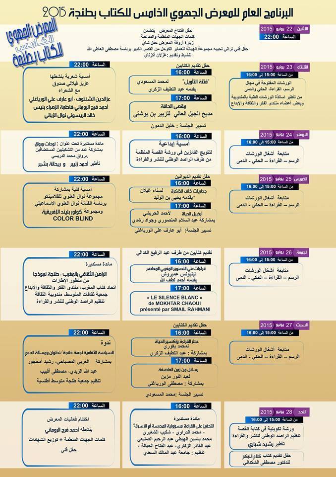 البرنامج العام للمعرض الجهوي للكتاب الخامس للكتاب بطنجة 2015 في 18 يونيو 2015 الساعة 7 و 25 دقيقة شارك FacebookWhatsAppTwitterالبريد الإلكترونيLinkedinطباعةTelegramالإشهار 2 شارك FacebookWhatsAppTwitterالبريد الإلكترونيLinkedinطباعةTelegram