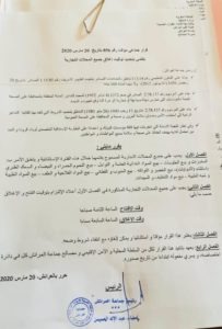 أصدرت جماعة العرائش قرارا جماعيا مؤقتا رقم 856 بتاريخ 20 مارس 2020 والمتعلق بتحديد توقيت اغلاق جميع المحلات التجارية ، وينص هذا القرار على ان جميع المحلات التجارية المسموح فتحها خلال هذه الفترة الاستثنائية ويتعلق الامر ب : المخابز و بيع الحلويات ، بيع المواد الغذائية العامة والتوابل ،بيع اللحوم الحمراء والبيضاء والسمك الطري ماعدا الشوايات، بيع الخضر والفواكه ، بيع الحبوب والقطاني ، بيع المواد الفلاحية والعلف ،بيع المواد الطبية والشبه الطبية ، ببع مواد التنظيف والمبيدات .