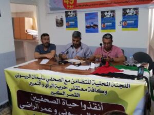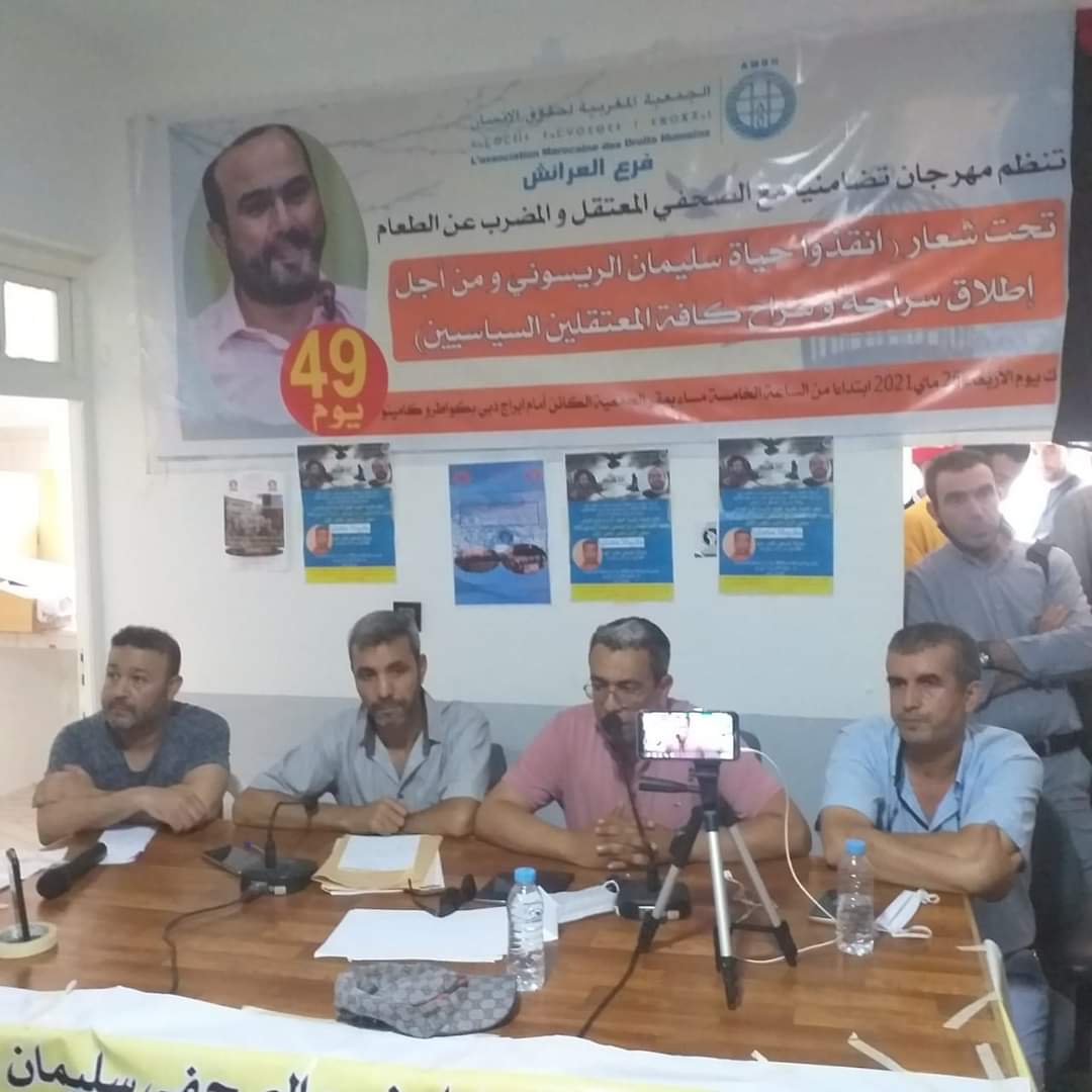 في مهرجان خطابي تضامني مع الصحافيين سليمان الريسوني و عمر الراضي دعت له لجنة التضامن بالقصر الكبير مع الصحفي المعتقل والمضرب عن الطعام سليمان الريسوني و من أجل التضامن مع المعتقلين السياسيين و معتقلي الرأي و من أجل المطالبة بإطلاق سراح الصحفيين المضربين عن الطعام سليمان الريسوني و عمر الراضي.نظم بمقر الجمعية المغربية لحقوق الانسان فرع العرائش اليوم الأربعاء 26ماي2021 .
