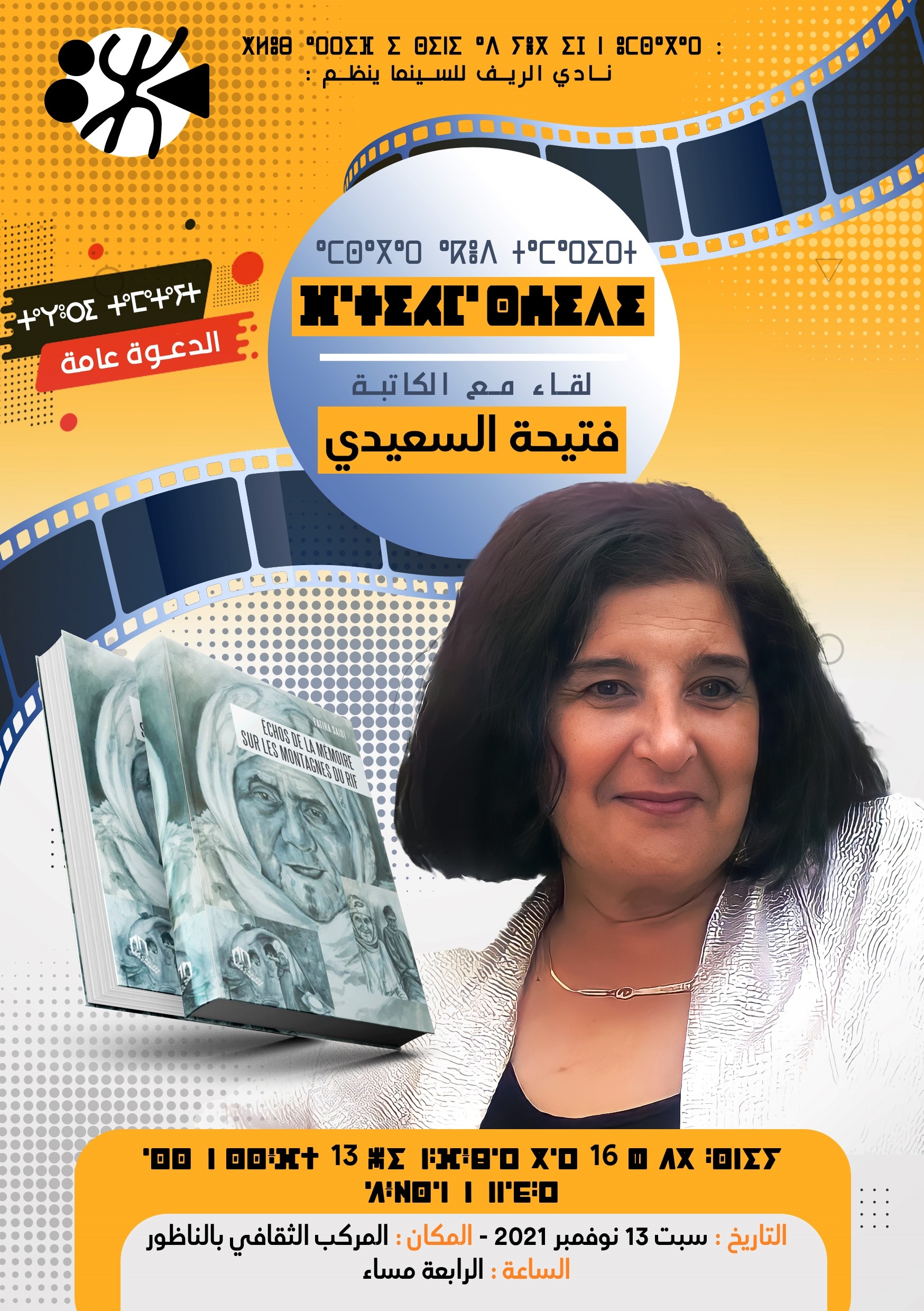 ينظم نادي الريف للسينما بالناظور لقاء مع الكاتبة فتيحة السعيدي، بالإضافة إلى حفل تقديم وتوقيع كتاب “أصداء الذاكرة حول جبال الريف” وذلك يـوم السبت 13 نوفمبر 2021، بقاعة مكتبة المركب الثقافي بالناظور، ابتداء من الساعة الرابعة مساء، حسب البرنامج التالي:
