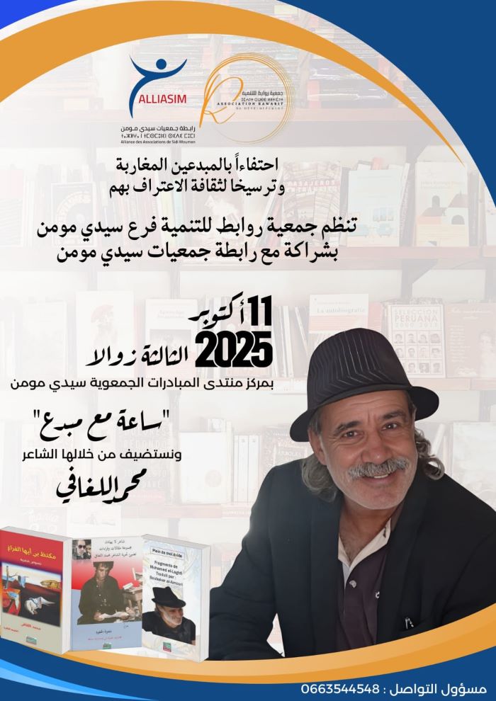 تحتفي المبادرة الثقافية “ساعة مع مبدع” بالشاعر محمد الغافي تحت شعار “الإبداع تنمية وإشعاع”. هذه المبادرة تأتي في إطار تفعيل البرنامج الثقافي لجمعية روابط للتنمية فرعي دار بوعزة وسيدي مومن، وتهدف إلى التعريف بالمبدعين المغاربة والتواصل المباشر معهم في مختلف مجالات الإبداع.