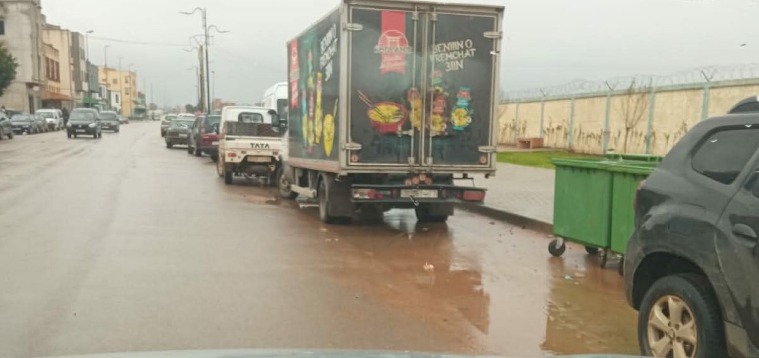 والمشكل أن مجموعة من الشاحنات والجرارات : لا تحترم علامات منع التوقف وخاصة بشارع المسيرة الخضراء المزدحم بالمارة و المتسوقين.