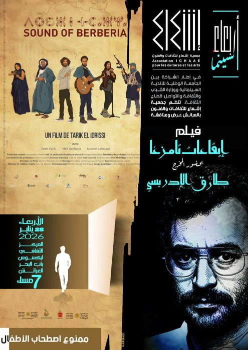 بلاغ صحفي/ احتفاء بالثقافة الامازيغية ،وفي إطار الشراكة المبرمة بين الجامعة الوطنية للأندية السينماءية بالمغرب ووزارة الشباب والثقافة والتواصل/قطاع الثقافة،تعلن جمعية إشعاع للثقافات والفنون بالعرائش إلى عموم الجمهور والمهتمين بالسينما والثقافة، عن تنظيم عرض ومناقشة لفيلم “إيقاعات تامزغا”،بحضور مخرجه طارق الادريسي ،ضمن فقرة “أربعاء السينما ” الشهرية ،التي تدخل موسمها الثاني ،وذلك يوم الأربعاء 28 يناير 2026 بالمركز الثقافي ليكسوس باب البحر على الساعة السابعة مساء