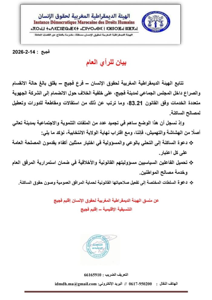 الهيئة الديمقراطية المغربية لحقوق الإنسان، فرع فجيج، عبرت عن قلقها بشأن الأوضاع في مدينة فجيج، خاصة مع اقتراب انتهاء الولاية الانتخابية للمجلس الجماعي. المجلس يعاني من انقسام بين فريق المعارضة وفريق الأغلبية منذ أكثر من سنتين، مما أدى إلى استقالات متكررة وتعطيل العمل الجماعي.