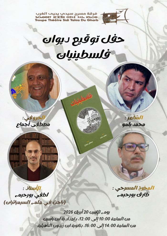 في إطار الانفتاح على الفاعلين الثقافيين وتعزيز الدينامية التربوية والفنية داخل المؤسسات التعليمية، تنظم فرقة مسرح سيدي يحيى الغرب بشراكة مع النادي التربوي والثقافي بثانوية ابن زيدون التأهيلية والثانوية الإعدادية ابن ياسين، حفل توقيع الديوان الشعري “فلسطينيات”، للشاعر محمد بلمو والحروفي مصطفى أجماع.