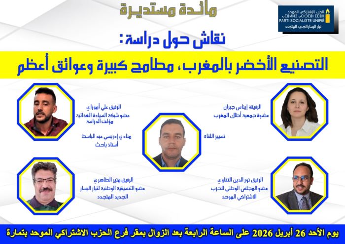 في إطار أنشطتها الفكرية والنقاشية تنظم تنسيقية تيار اليسار الجديد المتجدد – الحزب الاشتراكي الموحد مائدة مستديرة لتقديم ومناقشة دراسة بعنوان:”التصنيع الأخضر بالمغرب: طموحات كبرى وإكراهات أكبر” من إنتاج المعهد العابر للقوميات ( TNI) بالشراكة مع أطاك المغرب.