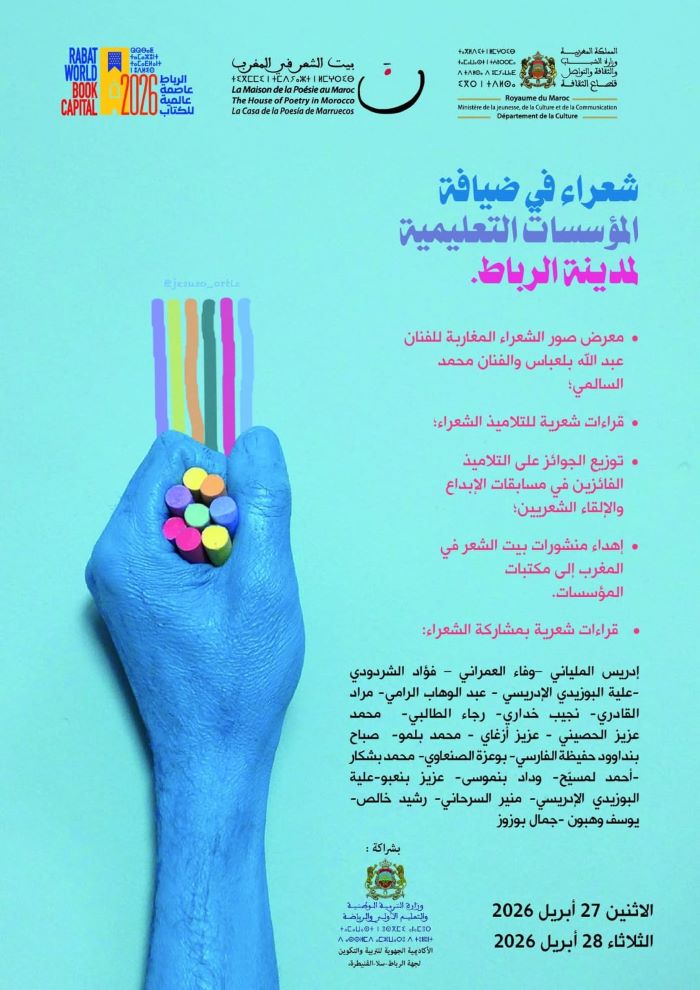 ” شعراء في ضيافة المؤسسات التعليمية” ،هو البرنامج الثقافي والشعري والفني الذي يُطلقه بيت الشعر في المغرب، يومي 27 و28 أبريل 2026 بعدد من المؤسسات التعليمية لمدينة الرباط ، وذلك في إطار الاحتفال بمدينة الأنوار عاصمة عالمية للكتاب لسنة 2026.