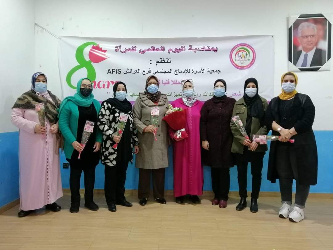 نظمت جمعية الأسرة للإدماج المجتمعي فرع العرائش AFIS حفلا فنيا تكريميا بمناسبة اليوم العالمي للمرأة وذلك يوم الاثنين 8 مارس 2021.حيث تم تكريم نساء أسدين خدمات جليلة في مشوار فني وثقافي ومهني حافل يجمعهن عامل مشترك واحد وهو التميز وروح القيادة.