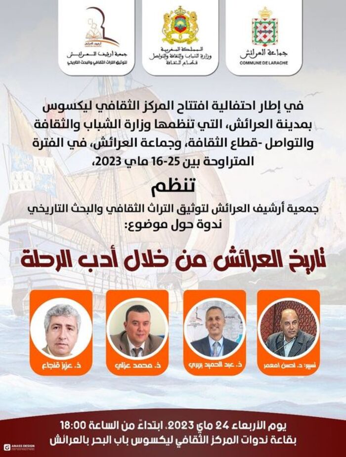 في إطار احتفالية افتتاح المركز الثقافي ليكسوس بمدينة العرائش، التي تنظمها وزارة الشباب والثقافة والتواصل -قطاع الثقافة، بشراكة مع جماعة العرائش، في الفترة المتراوحة بين 16-25 ماي 2023، وفي سياق مساهمة جمعية أرشيف العرائش في إغناء برنامج الاحتفالية عبر أنشطة تتماهى وتوجه الجمعية الرامي إلى توثيق التراث الثقافي والبحث التاريخي، عُقد العزم على تنظيم ندوة حول موضوع: “تاريخ العرائش من خلال أدب الرحلة”، وذلك مساء يوم الأربعاء 24 ماي 2023، بفضاء المركز الثقافي ليكسوس المتواجد بساحة باب البحر بالعرائش ابتداءً من الساعة 18:00 مساء.
