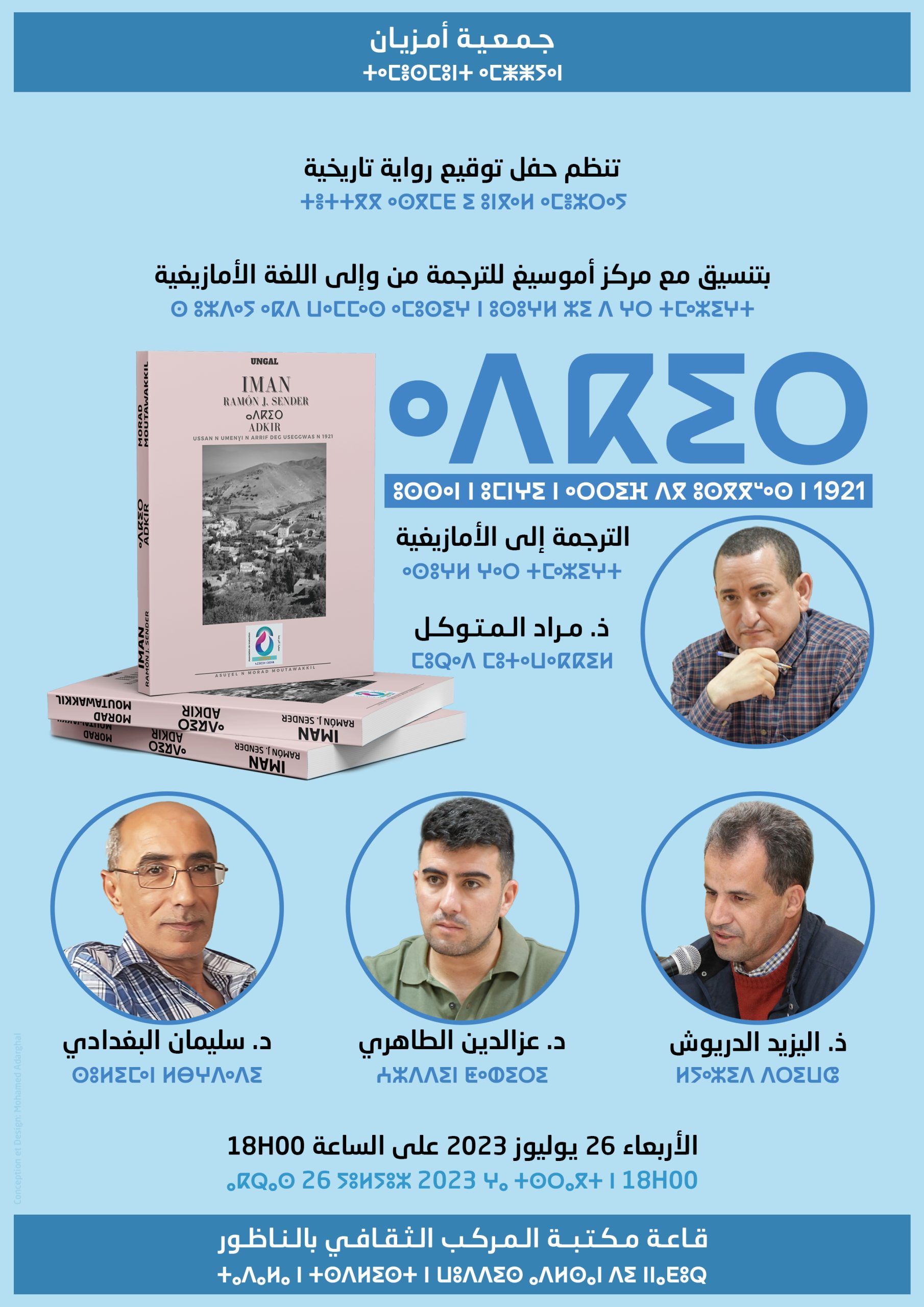 تخليدا للذكرى الثانية بعد المائة لمعركة أنوال المجيدة، تنظم جمعية أمزيان بتنسيق مركز أموسيغ للترجمة من وإلى اللغة الأمازيغية، حفل توقيع وتقديم الرواية التاريخية (ADKIR)، وسيشارك في هذا الحفل كل من الدكتور عزالدين الطاهري والدكتور سليمان البغدادي والباحث اليزيد الدريوش، بالإضافة إلى الكاتب والمترجم مراد المتوكل، وذلك يوم الأربعاء 26 يوليوز 2023، بقاعة مكتبة المركب الثقافي بالناظور على الساعة السادسة مساء.