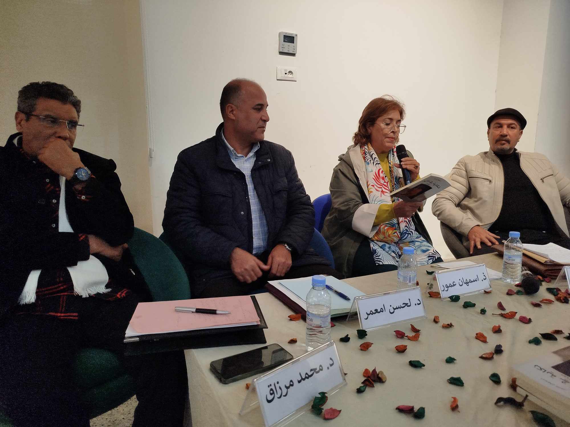 وانجز الدكتور مصطفى العطار عرضا نقديا وسمه بتأو يلية الألم في المنجز السردي للكاتبة والإعلامية اسمهان عمور. ناب عنه في تقديمه الدكتور محمد مرزاق خلص فيه الناقد الى ان علاقة الكاتبة بالألم هي علاقة فلسفية وثقافية من خلال استحضار البعد الابستمولوجي والإنتروبولوجي الى جانب استحضار البعد الإنساني باعتبار أن الكاتبة اعتبرت أن قتل الإنسان هو اندحار الإنسانية .